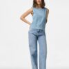 Crafted from premium denim fabric, it provides a soft, durable feel while maintaining a structured silhouette. The sleeveless top allows for easy layering or standalone styling, while the tailored bottoms ensure a flattering and comfortable fit. Pair with sneakers or casual sandals for a laid-back vibe, or dress it up with heels and accessories for a chic, urban look.